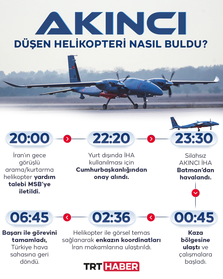 Kötü hava şartları nedeniyle helikopterin uçuş gerçekleştirememe ihtimali göz önüne alınarak; gece ve kötü hava şartlarında tespit ve görüş yetenekleri üst seviyede olan Akıncı İHA ile arama ve tespit yapılabileceği, talep edilmesi halinde hemen faaliyete başlanabileceği Dışişleri Bakanlığı üzerinden İran tarafına iletildi.