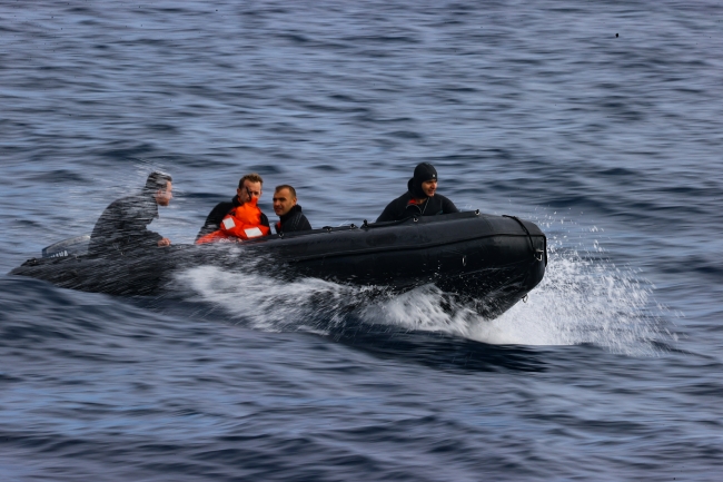 Senaryo gereği denize düşen göçmenler, Sahil Güvenlik helikopteri tarafından kurtarıldıktan sonra Sahil Güvenliğe ait bir korvete güvenle indiriliyor.