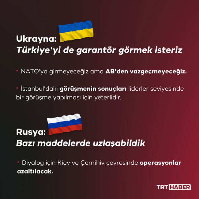 Bugün de (29 Mart) her iki tarafın müzakere heyetlerini İstanbul’da bir araya getirdik. Toplantının açılışının Sayın Cumhurbaşkanımız tarafından yapılması her iki ülkeye ve barışın sağlanmasına verdiğimiz önemin bir göstergesidir. Her aşamada taraflar arasında yakınlaşmanın arttığını bugün memnuniyetle görüyoruz. Bu sürece katkıda bulunmaktan, destek vermekten büyük bir memnuniyet duyuyoruz. Her zaman vurguladığımız gibi en öncelikli konu bir an önce ateşkesin sağlanması kalıcı bir siyasi çözümün önünün açılmasıdır. Binlerce insanın ölmesine, milyonlarca insanın yerlerinden edilmesine yol açan bu savaş artık durmalıdır. Bugün burada gerçekleştirilen toplantıda bu konuda bir mesafe katedildiğini görüyoruz.