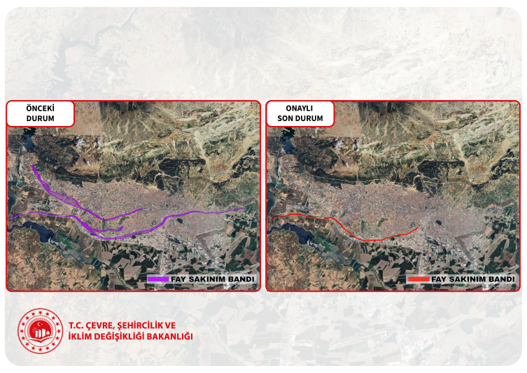 Bakan Kurum “Kentin güneyinden geçen fay segmentinde deprem üretme potansiyeli tespit edilmiştir. 70 metre genişliğinde ‘fay sakınım bandı’ bırakılmıştır” bilgisini verdi.