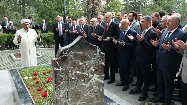 Cumhurbaşkanı Recep Tayyip Erdoğan, Alparslan Türkeş’in oğlu, AK Parti Ankara Milletvekili Yıldırım Tuğrul Türkeş ile gittiği anıt mezarda dua okudu.