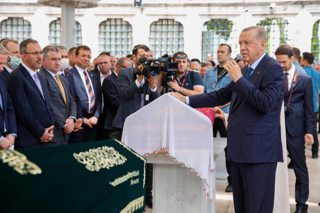 Erdoğan, “Biz Fethiye ablamızın çok böreklerini yedik. Güzel börek yapardı. Arada sırada da bu Tayyip evladına da gönderirdi. O da bize hakkını helal etsin. Rabb’im inşallah sevgili habibinin livaül hamd ismiyle müsemma sancağı altında bizleri haşru cem eylesin” şeklinde konuştu.