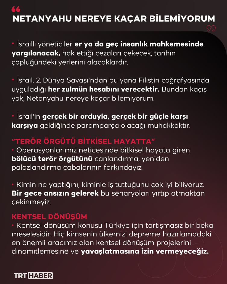“İsrail, 2. Dünya Savaşı’ndan bu yana Filistin coğrafyasında uyguladığı her zulmün hesabını elbette verecektir. Bundan kaçış yok, Netanyahu nereye kaçar bilemiyorum. Mülteci kamplarında uyguladığı katliamlar ve Gazze’de 7 Ekim’den bu yana işlediği savaş suçları, bu ülkeyi yönetenlerin yakın gelecekteki yargılanmalarında ayrı bir yere sahip olacaktır. Türkiye, kendisi gibi düşünen devletler ve sivil toplum kuruluşları ile birlikte bu meseleyi her platformda gündeme getirecek, takip edecek ve somut sonuçlara ulaşmasını sağlamak için sonuna kadar çalışacaktır. Evet, İsrailli yöneticiler, er ya da geç insanlık mahkemesinde yargılanacak, hak ettikleri cezaları çekecek, tarihin çöplüğündeki yerlerini alacaklardır. Daha önemlisi Netanyahu yönetimine bu cüreti veren, işlediği insanlık suçlarının üzerini örten Batılı ülkeler de aynı akıbeti paylaşacaklardır. Şayet Amerika ve Avrupa ülkeleri, İsrail’e sınırsız siyasi, askeri ve ekonomik destek vermemiş olsa bu terör devletinin yöneticileri böylesine pervasız ve acımasız hareket edemezdi.“