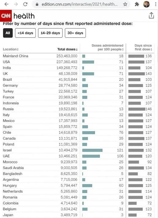 Grafik 1. Uygulanan toplam aşı dozajına göre ülkeler sıralaması (Kaynak: CNN)