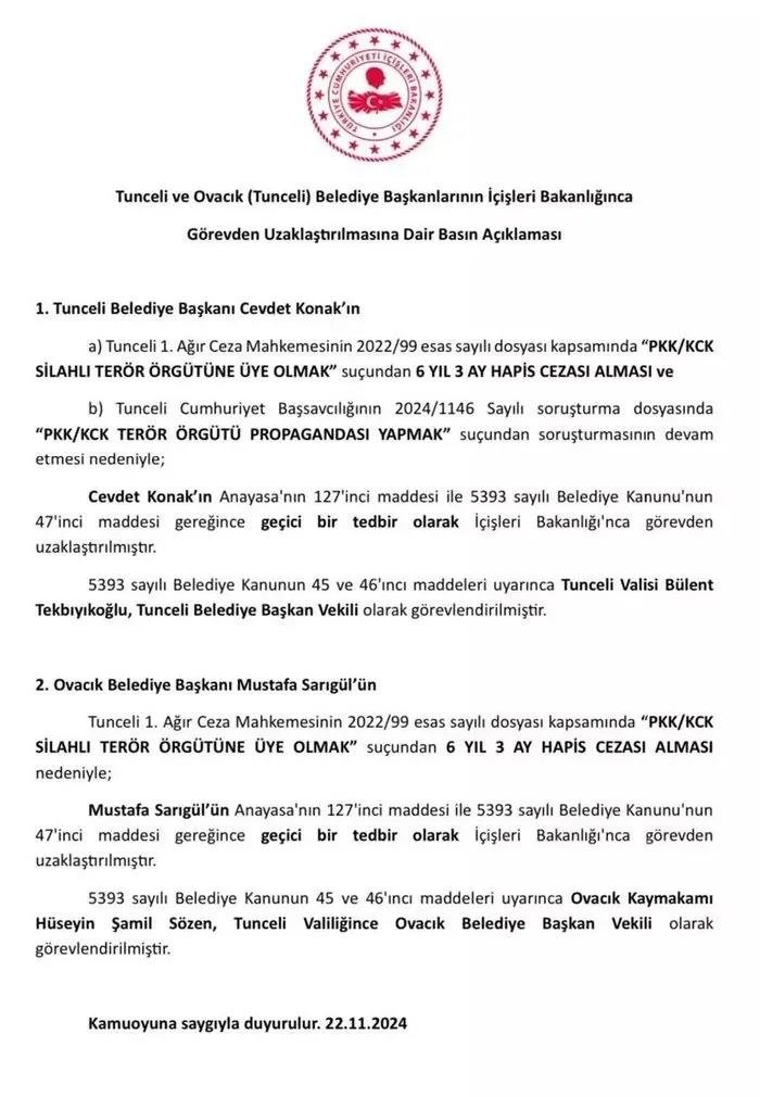 Tunceli Belediye Başkanı Cevdet Konak’ın yerine Tunceli Valisi Bülent Tekbıyıkoğlu, Ovacık Belediye Başkanı Mustafa Sarıgül’ün yerine ise Ovacık Kaymakamı Hüseyin Şamil Sözen Başkan Vekili olarak görevlendirildi.