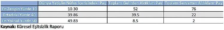 Dünyanın en zengin yüzde 10’luk kesimi toplam gelirin yüzde 52’sini, servetin ise yüzde 76’sını elinde tutuyor. En alttaki yüzde 50’lik kesim ise toplam gelirin ve servetin sırasıyla sadece yüzde 8.5’i ve 2’sine sahip.