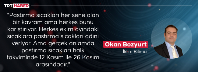 “Buna pastırma yazı ya da pastırma sıcakları deniyor ama burada bir eksiklik var. Aslında halkın tam tabiri ‘pastırma yazı ve ayazı’dır. Yani gündüzü yaz gecesi ayaz. Çünkü burada bir yüksek basınç koşulu meydana gelir. Kasım ayında gece ve gündüz sıcaklık farkı arttığı için, gündüz oldukça sıcak ve güneşli bir hava yaşanırken, gece de bulutsuz olduğu için de oldukça soğuk bir hava olur.”