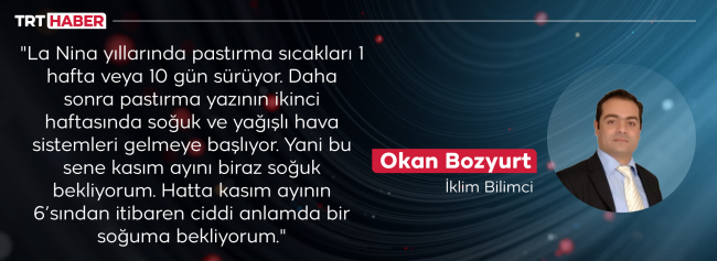 “La Nina yıllarında pastırma sıcakları 1 hafta veya 10 gün sürüyor. Daha sonra pastırma yazının ikinci haftasında soğuk ve yağışlı hava sistemleri gelmeye başlıyor. Yani bu sene kasım ayını biraz soğuk bekliyorum. Hatta kasım ayının 6’sından itibaren ciddi anlamda bir soğuma bekliyorum. Pastırma yazı öncesinde geçici bir kış yaşayacağız. Hatta belki iç kesimlerde pek çok şehir merkezine mevsimin ilk kar yağışları gerçekleşebilir.”