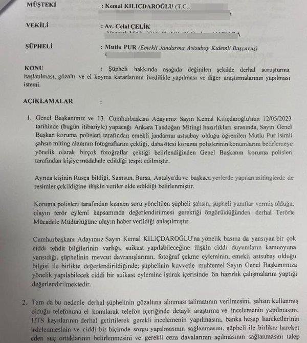 Sabah Gazetesi’nden Halit Turan’ın haberine göre Ankara’da Tandoğan mitingi öncesinde Kemal Kılıçdaroğlu’nun korumaları, miting alanının fotoğrafını çeken bir kişiyi görünce harekete geçti. Miting alanındaki Ankara Emniyet Müdürlüğü Terörle Mücadele Şubesi ekipleri tarafından Mutlu P. isimli emekli Özel Kuvvetleri mensubu gözaltına alındı. Şüpheli sorgu için emniyete götürülürken, Kemal Kılıçdaroğlu’nun avukatı Celal Çelik ise hemen harekete geçti. Kemal Kılıçdaroğlu adına şikayet dilekçesi hazırlayan Çelik, Ankara Cumhuriyet Başsavcılığı’ndan emekli kıdemli başçavuş hakkında detaylı soruşturma yapılmasını istedi. Çelik’in sunduğu dilekçede miting alanında fotoğraf çeken şüphelinin telefonuna el konulmasını, bağlantılarının araştırılmasını, hakkında derhal soruşturma yapılarak bağlantılarının çıkarılması istenildi.