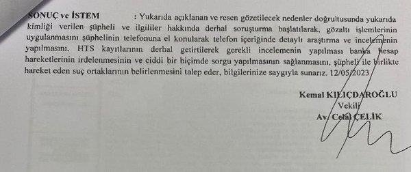 İfadeler sonrasında Kemal Kılıçdaroğlu’nun avukatı Celal Çelik, yakalanan kişinin CHP tarafından tutulan emekli asker olduğunun ortaya çıkmasının ardından Ankara Emniyetine koştu. Celal Çelik yeniden Kemal Kılıçdaroğlu adına dilekçe verdi.