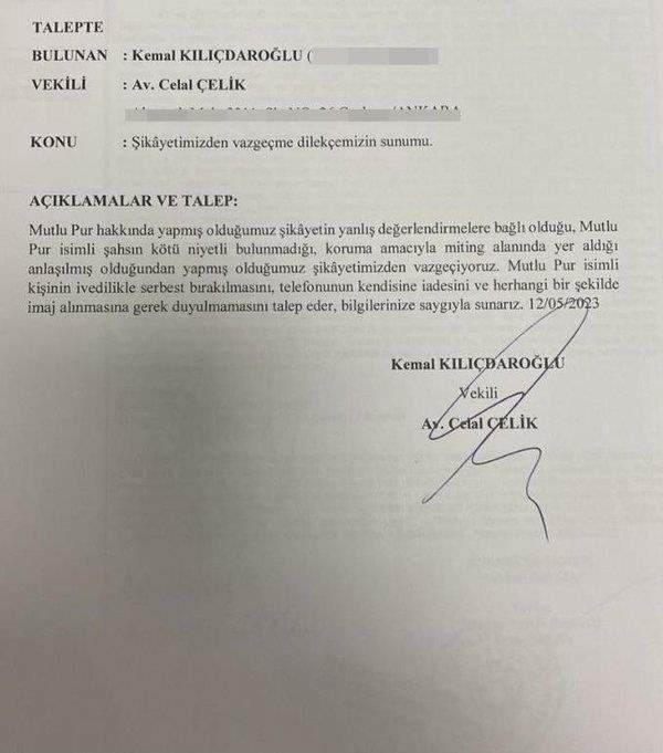 Çelik dilekçesinde bu kez “Mutlu P. Hakkında yapmış olduğumuz şikayetin yanlış değerlendirmelere bağlı olduğu belirlenmiştir. Yaptığımız şikayetten vazgeçiyoruz. Mutlu P.’nin ivedilikle serbest bırakılmasını, telefonun kendisine iadesini ve herhangi bir şekilde imajının alınmasına gerek duyulmamasını talep eder, bilgilerinize saygıyla sunarız” dedi.