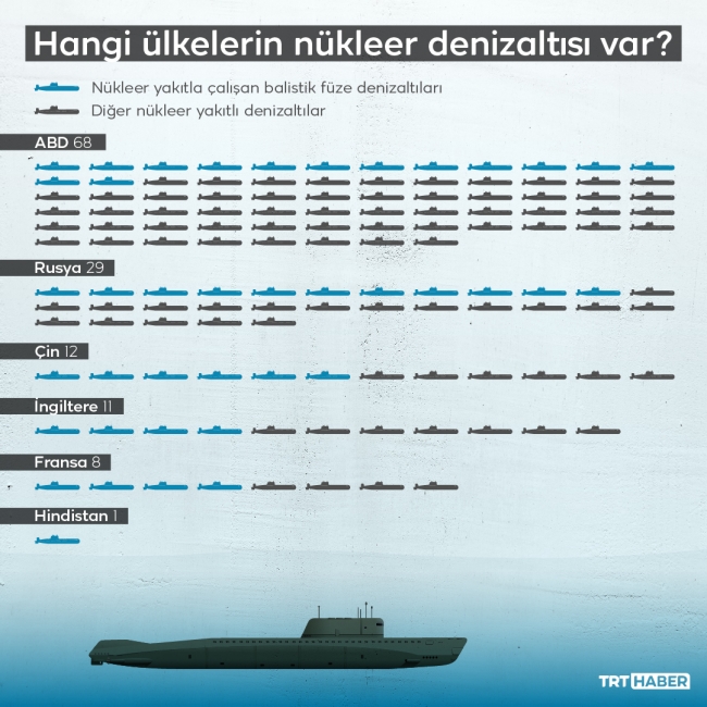 Halihazırda nükleer enerjili denizaltına sahip 6 ülke bulunuyor. Toplam sayı ise 129.