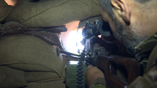 Asker ve mühimmat takviyesi yapılan mevzide eller tetikte. Tel Rıfat kırsalındaki mevzilere yerleştirilen keskin nişancılar, 7/24 Minnag köyündeki teröristleri izliyor.