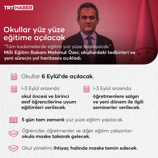 Eğitim öğretim tüm kademelerde 6 Eylül’de yüz yüze başlayacak. Milli Eğitim Bakanı Mahmut Özer, hedeflerinin sağlık koşulları aksini gerektirmediği sürece salgın öncesinde olduğu gibi okullarda tam zamanlı yüz yüze eğitimi devam ettirmek olduğunu söyledi.